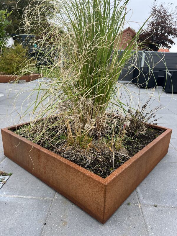 - Lang levetid og vedligeholdelsesfrit: Cortenstål danner en beskyttende patina, som gør højbedene robuste og vejrbestandige.